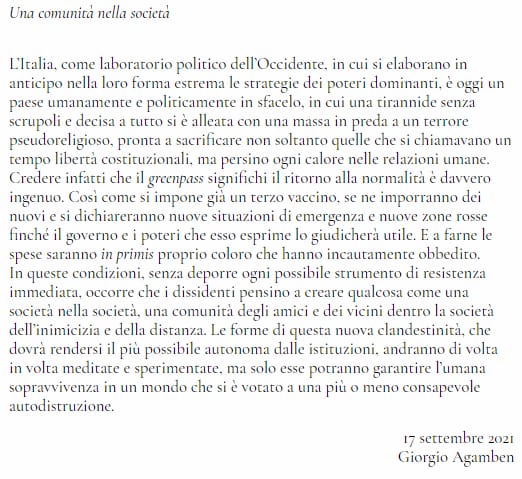 Otto anni dopo, a seguito della “situazione emergenziale” persistente ormai da quasi due anni, ci uniamo all’appello di Giorgio Agamben di poche settimane fa.